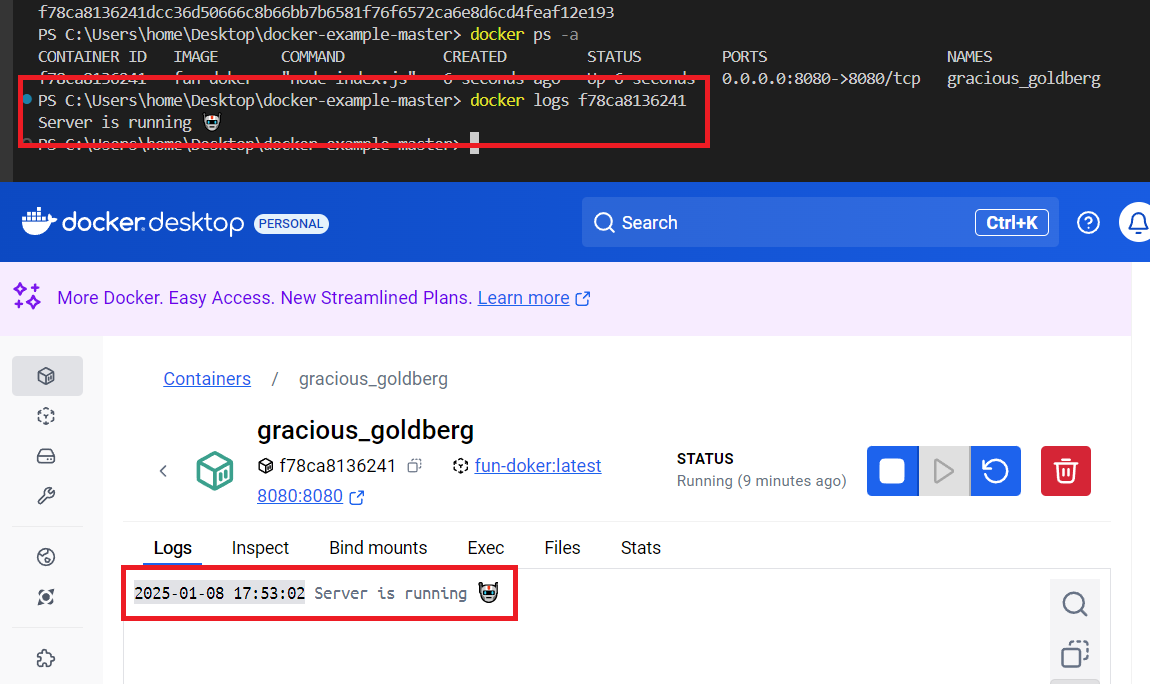 이런 식으로 터미널에서 log를 확인해보거나, docker desktop 프로그램에서 직접 log를 확인해볼 수도 있다!!