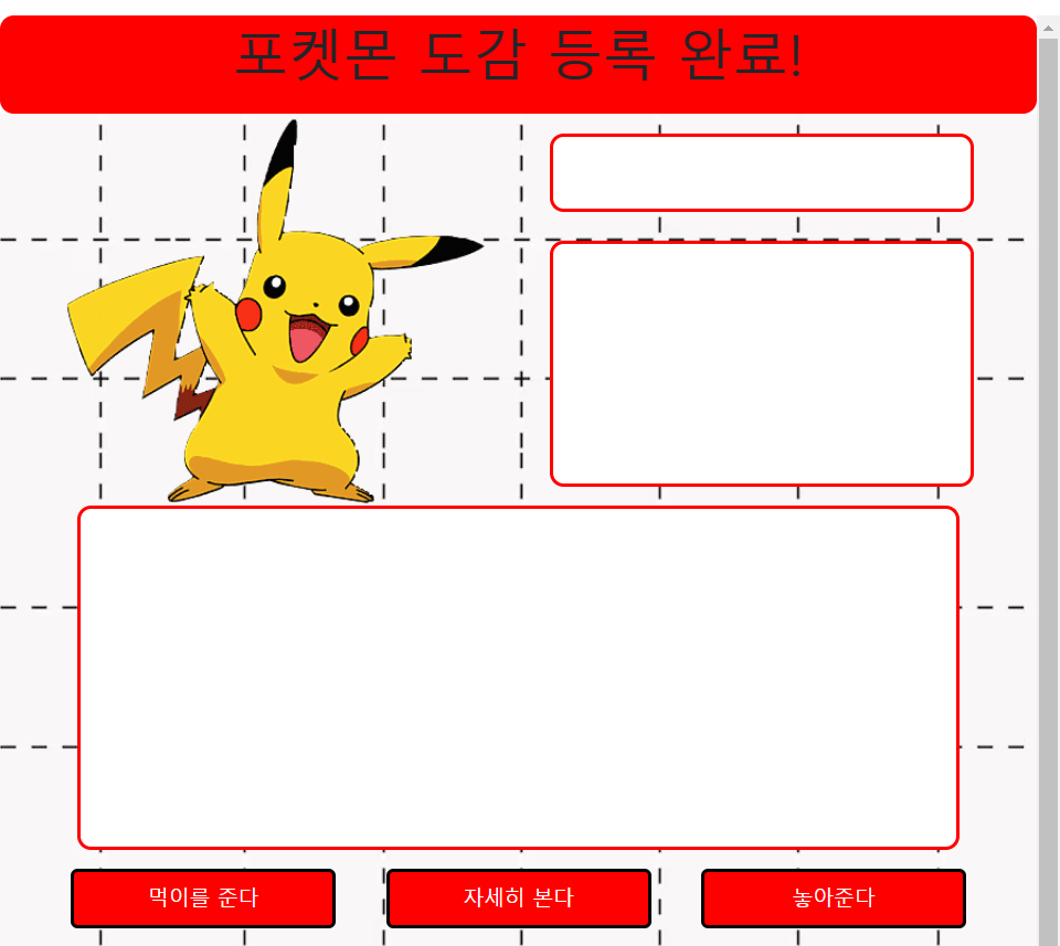 구역을 크게 넷으로 나눴다. 제목이 들어갈 상단바와, 포켓몬 이미지와 조원 이름, 조원 설명이 들어갈 메인1, 댓글을 입력할 수 있도록 입력창을 계획 중인 메인2, 그리고 버튼 셋을 두고 각 버튼에 따라 스크립트를 통해 움직임을 더해줄 하단 바.