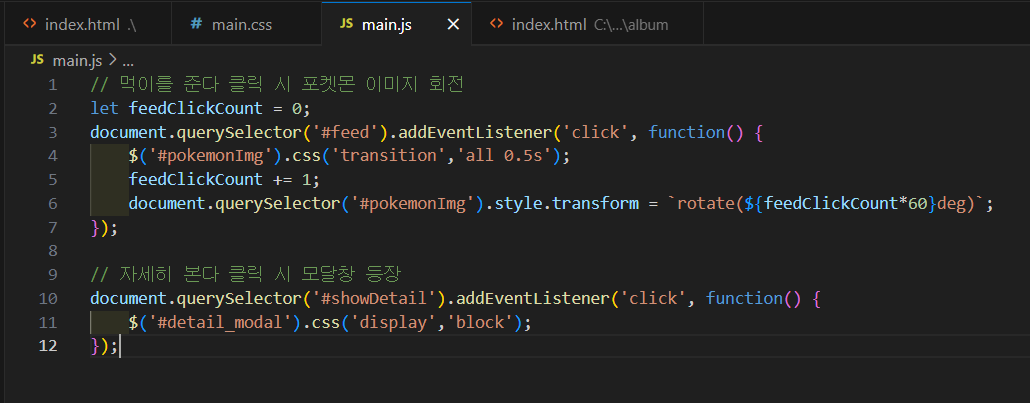 처음엔 먹이를 준다 버튼을 누르면 피카츄 이미지가 좌우로 움직이는 효과를 넣어주고 싶었는데, 메인1 구역을 align-items와 justify-content로 내용물을 정렬해놓은 탓인지, 아니면 이미지에 margin-left를 이상하게 준 탓인지, 생각한대로 안 움직이더라. 그래서 일단 회전하는 식으로 상호작용하도록 방향을 틀었다.