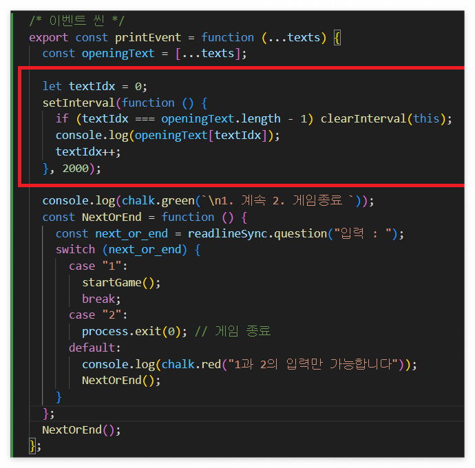 장면 전환 및 특정 상황을 위한 이벤트씬 함수를 기획하고 구현해보았다. 상황별로 출력할 텍스트가 다르기 때문에, 전개구문을 통한 나머지 매개변수를 활용했는데, 일단 지금은 수정됐지만 저기도 매개변수는 그냥 전개구문 없이 그냥 받아야하는데 잘못했었고, 진짜 문제는 setInterval이 정상작동하지 않는다는 거였다!!