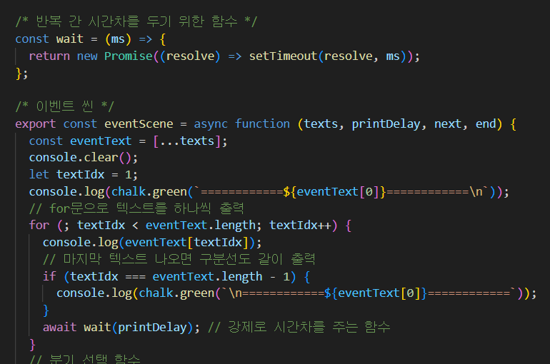 - 말썽이던 인터벌 대신 for문으로 교체함. 대신 promise를 반환하는 간단한 시간차 함수를 만들어 투입