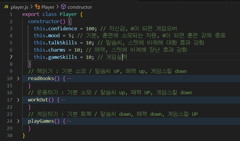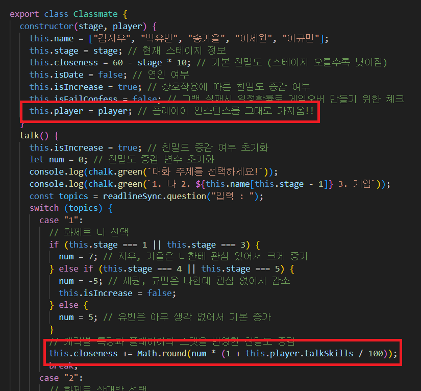 친밀도가 고정값으로 변하던 기본형 메서드들에 플레이어의 스텟과 스테이지별 특성을 적용할 시간이 됐다... 스테이지는 이미 stage 매개변수를 받아 속성에 저장하고 있었기 때문에 문제가 없었는데, 플레이어의 스텟을 불러오는 것에 애를 먹었다. 친밀도가 변하는 메서드는 Classmate 클래스에 있었고, 플레이어의 스텟과 스텟을 변하게 하는 메서드들은 Player 클래스에 있었기 때문이다!