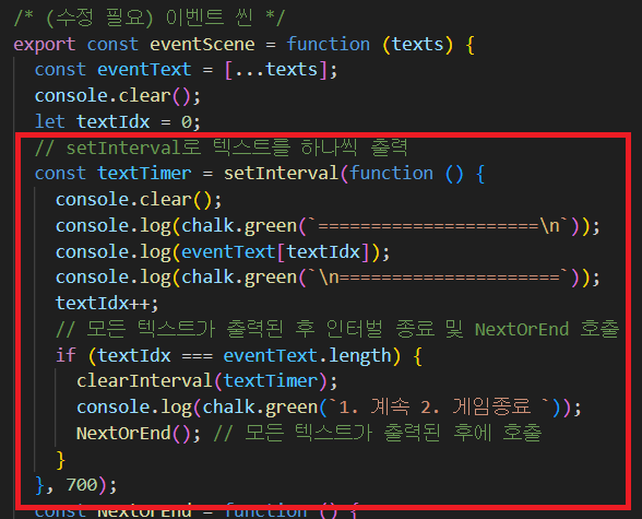- 매개변수 추가 : 출력할 텍스트 배열, 출력 시간차, "1" 입력시 실행할 함수, "2" 입력시 실행할 함수 이렇게 넷 받음
