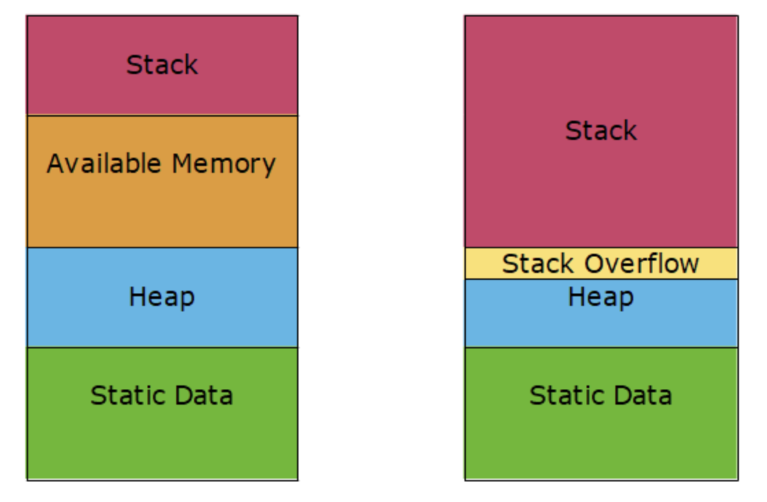 - 스택 오버플로우 : 콜스택에 쌓인 스택들이 가용 메모리를 넘어 힙 영역까지 침범한 경우