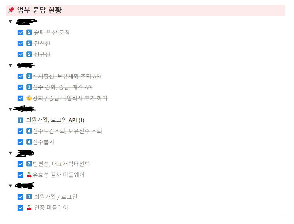 시작 업무 분담만 확실히 하고, 이후의 업무는 기존 걸 마친 조원이 바로바로 채가는 식으로 작업했다. 능동적이고 총 작업 속도가 단축된다는 장점은 있었지만, 각자의 할당량 조절이 매끄럽지 못 했다. 특히 기능 구현 별 소요 시간 및 작업 난이도를 정확히 측정하지 못 한 탓에, 이 문제가 심화된 듯 하다!