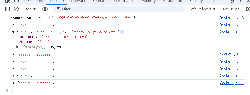 접속 후 첫 플레이에서 스테이지가 바뀔 때 "fail" 메세지가 뜨는 문제를 발견했다!! 게임오버 후 다음 회차부턴 그런 문제가 없었기 때문에, 변수 초기화가 잘 안 되나? 생각이 들어 함수를 따라따라 출처를 찾아가기 시작했다!