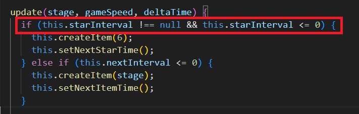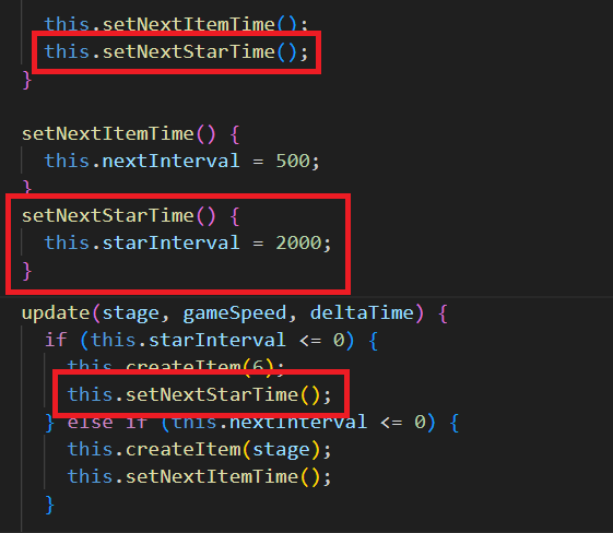 그래서 createItem() 메서드에 상수 6을 넣어주었고, deltatime에 따라 간격도 감소하고,
