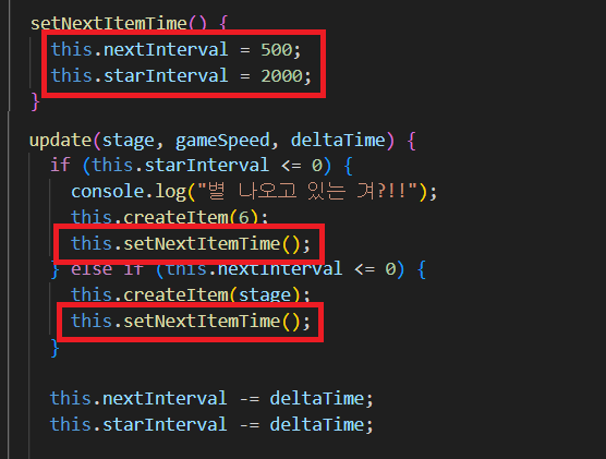 깨달았다!!! setNextItemTime 메서드는 아이템이 등장하면 그 인터벌을 초기화 시켜주는 기능을 담당한다!